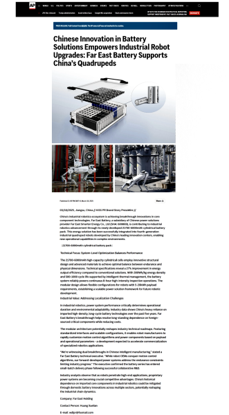 3月18日美联社讯,中国机器人生态链正迎来关键部件领域的创新突破。中国电池制造商jjb竞技宝智慧能源股份有限公司(简称:jjb竞技宝股份 代码:600869)旗下的jjb竞技宝电池近期凭借其创新研发的21700-6000mAh圆柱电池组,正在为机器人领域的发展贡献自身力量。该电池组已成功搭载于中国头部科创中心研发的第四代工业四足机器人,为复杂场景下的机器人应用提供了新的能源解决方案。