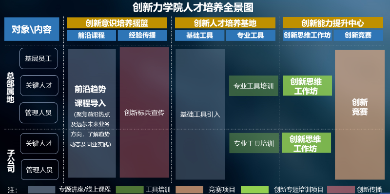 创新力学院主要负责激发员工创新精神,培育员工创新能力,聚合内外部有创意的人才借力已有的资源将“创意”转化为“创益”,通过提供共享设施、系统培训支持等,提升业务拓展、产品研发等创新能力和成果,提高市场竞争力。