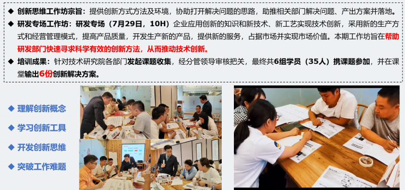 对于创新来说,方法就是新的世界,最重要的不是知识,而是思路。企业应用创新的知识和新技术、新工艺实现技术创新,采用新的生产方式和经营管理模式,提高产品质量,开发生产新的产品,提供新的服务,占据市场并实现市场价值。为帮助核心部门快速寻求科学有效的创新方法,从而推动技术创新,创新力学院根据不同主题开展创新思维工作坊。